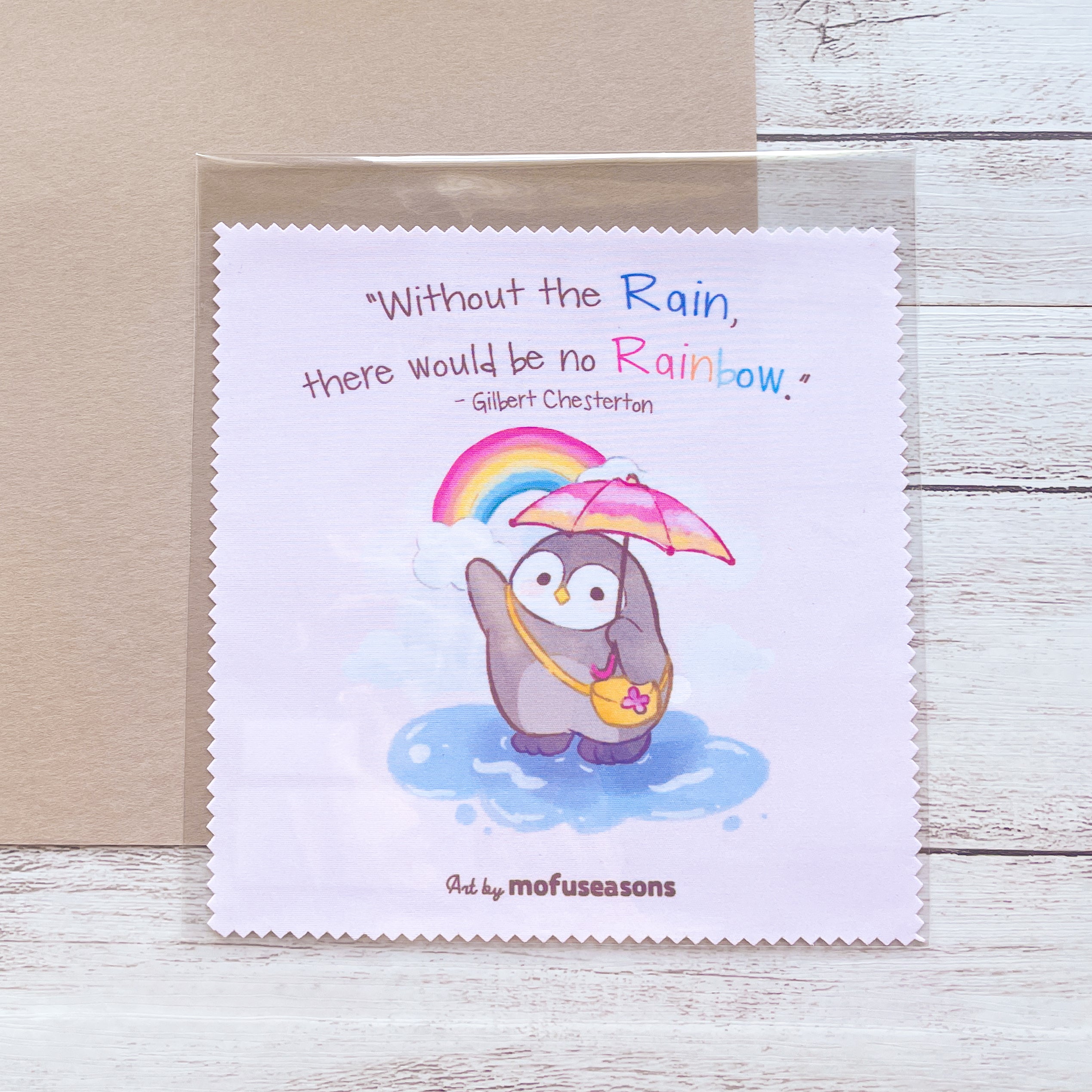 A soft microfiber lens cloth featuring a cute penguin with an umbrella and the quote “Without the rain, there would be no rainbow.” Gentle on lenses, practical, and uplifting.