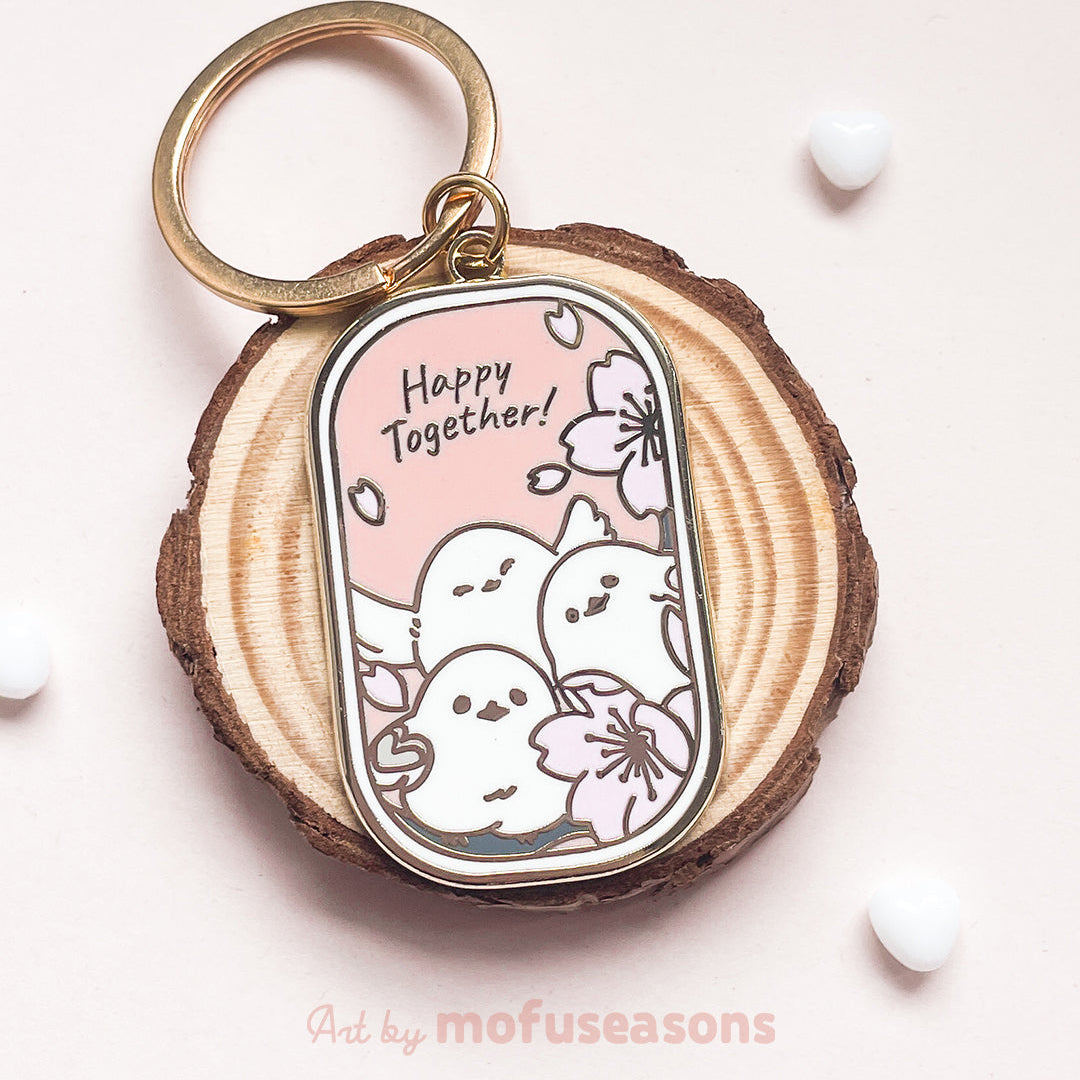This enamel keyring features three adorable shimaenaga surrounded by sakura blossoms, with the phrase “Happy Together.” A sweet design that celebrates friendship, love, and being close to the ones who matter.