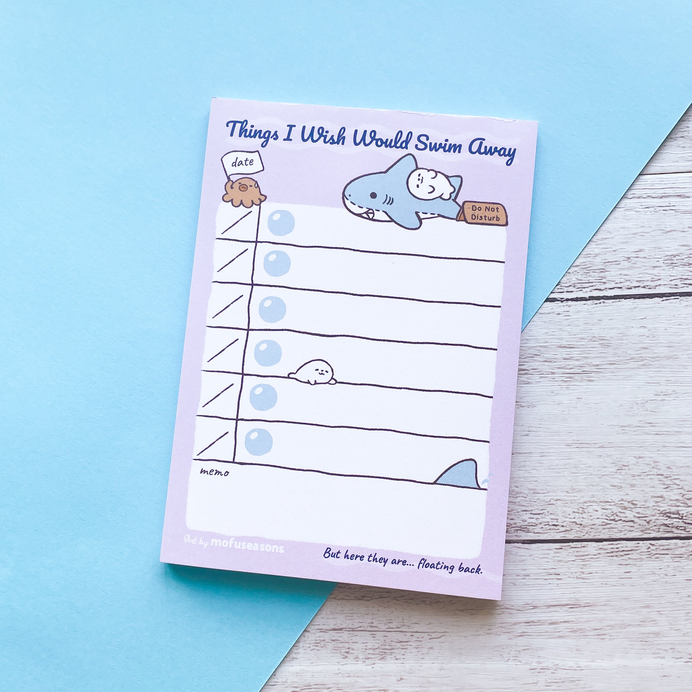 A notepad with a playful illustration of a lazy shark and seal, paired with the title “Things I Wish Would Swim Away.” Fun, practical, and perfect for jotting down reminders, errands, or notes.